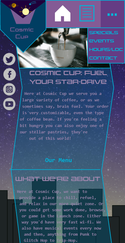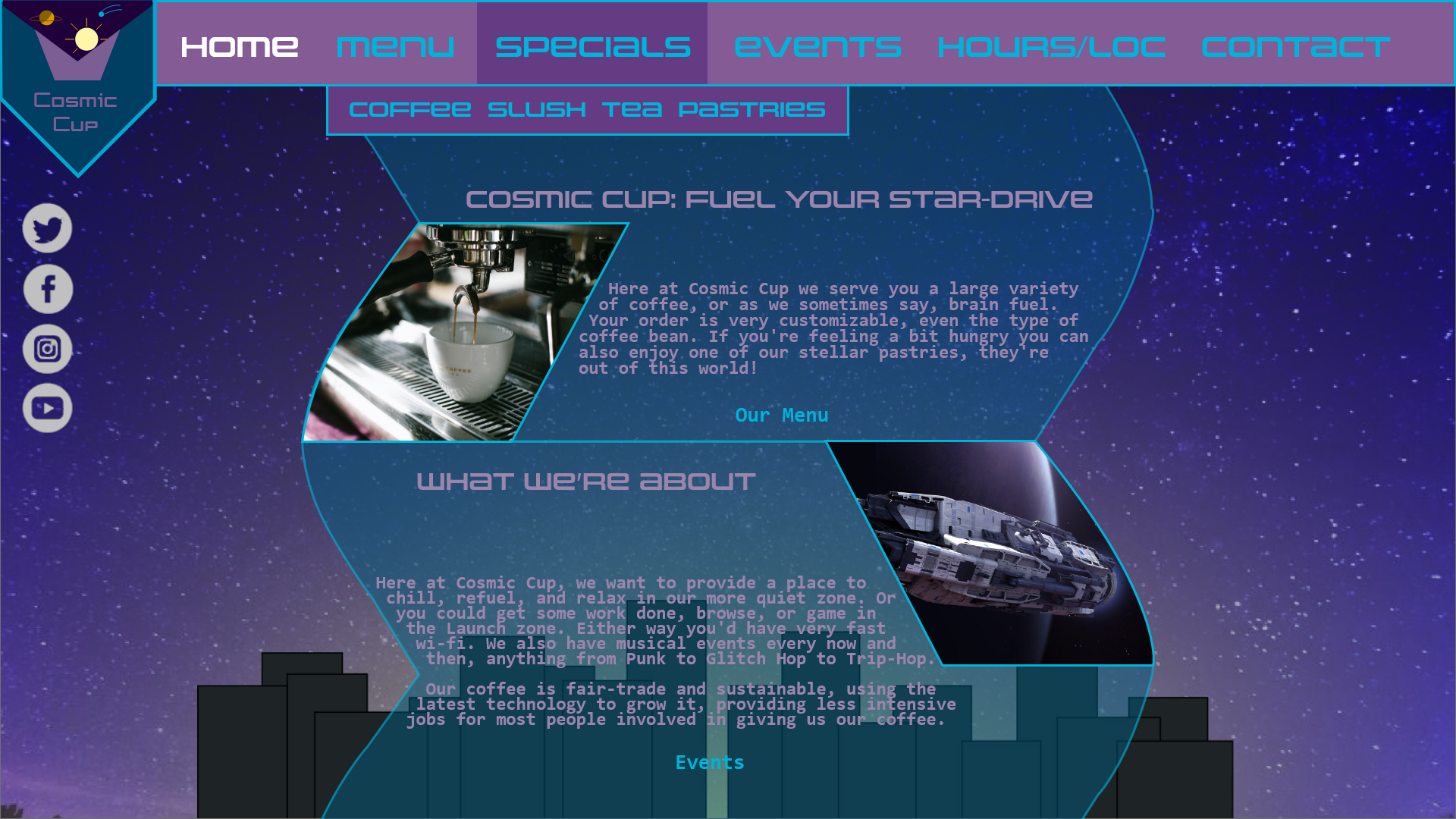 Cosmic Cup is a coffee shop with a hard sci-fi/cyberpunk theme that caters to both people who want to drink coffee and get work done and people who want to have a good time. One of their main selling points is gigabit wifi (very good bandwidth, fast internet).