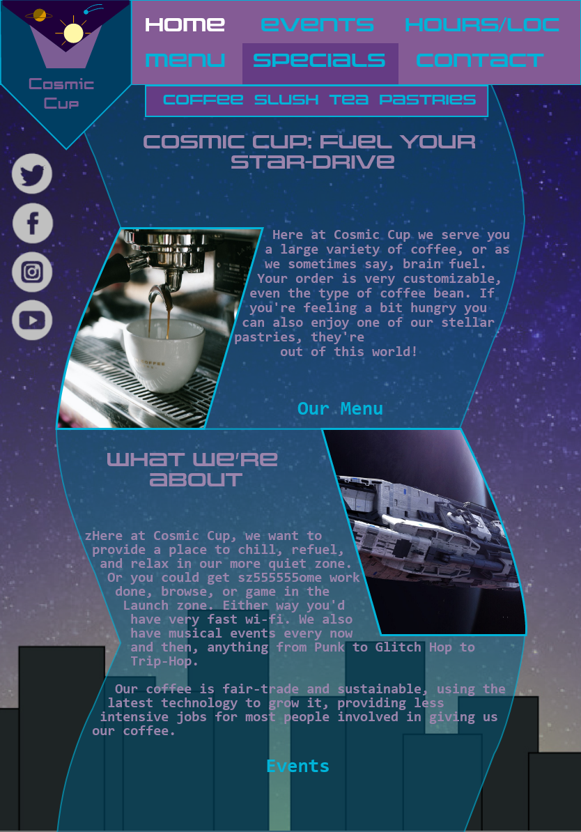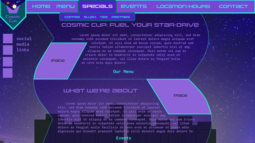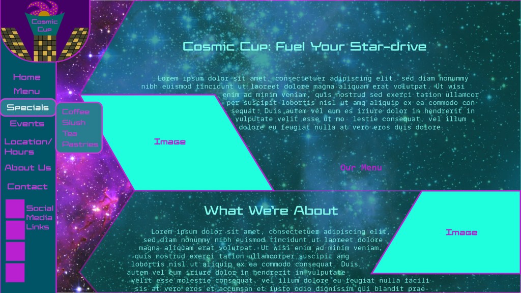 I thought about the project for a bit, and figured doing a cafe (coffee shop) would be a good idea since I’m a big fan of coffee. I then thought about which sub-culture I would cater to. There are lots of coffee shops already that cater to indie/hipster culture, so why not have something a bit different. I decided on a combination of hard space sci-fi and cyberpunk/vapor wave, as there was a lot of news about new rockets from multiple companies, especially the tourist space race between Virgin Galactic and Blue Origin in the summer of 2021. I also noticed when ever I was in a coffee shop there were lots of people on their laptops. Why not have a technology centered sub-culture themed cafe?
